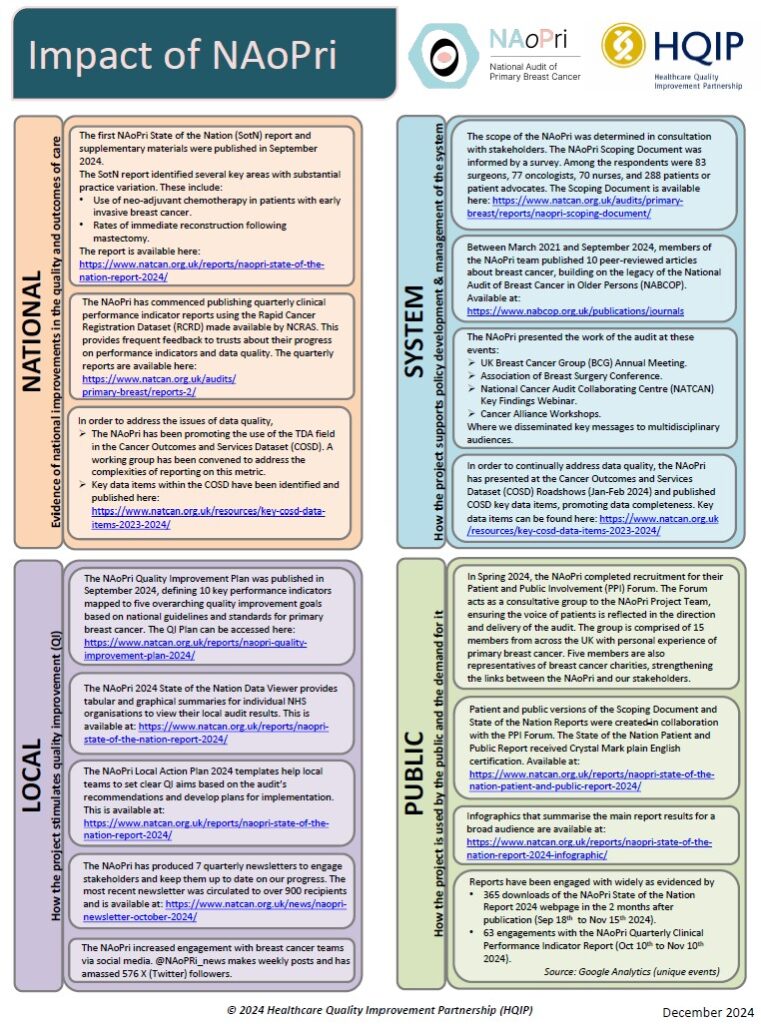 Every project within the NCAPOP has been established to address a clinical area (or areas) where healthcare improvement is required, and the common aim of each project is to have a positive impact on patient care. NCAPOP audits publish annual reports to summarise the key impacts the audits have had.