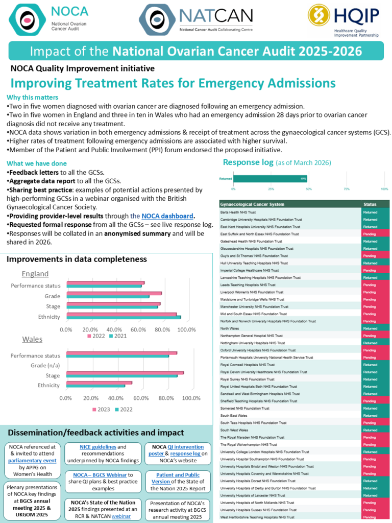 The NOCA is part of the National Cancer Audit Collaborating Centre (NATCAN) which is commissioned by the Healthcare Quality Improvement Partnership, on behalf of NHS England and the Welsh government as part of the National Clinical Audit and Patient Outcomes Programme (NCAPOP).